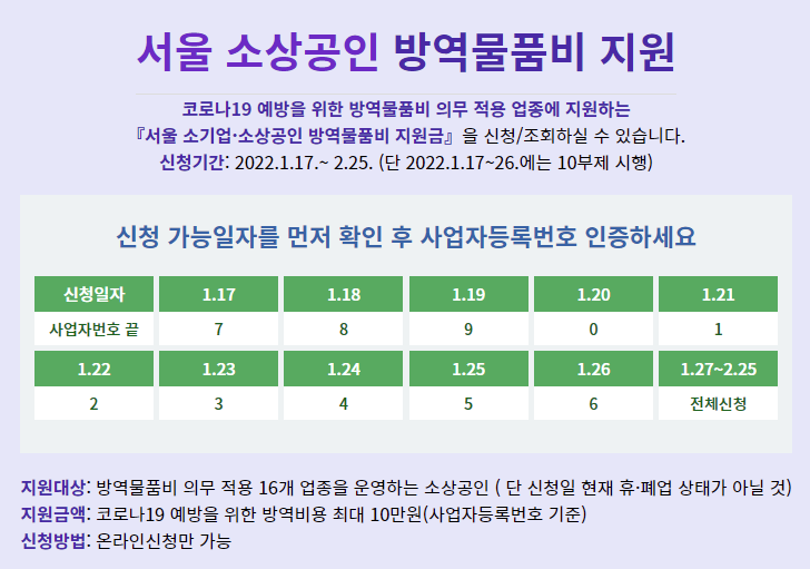 서울특별시 소재 소기업 및 소상공인은 서울 방역물품. kr로 신청 가능.