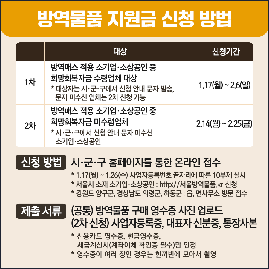 서울특별시 소재 소기업 및 소상공인은 서울 방역물품. kr로 신청 가능.
